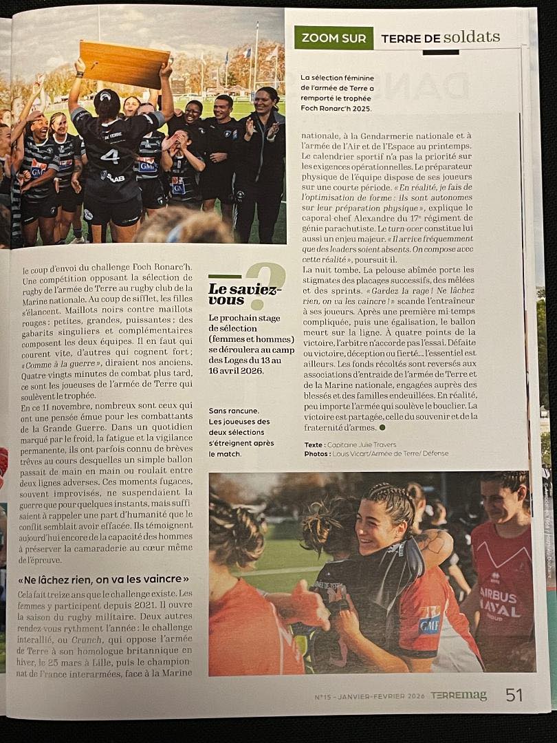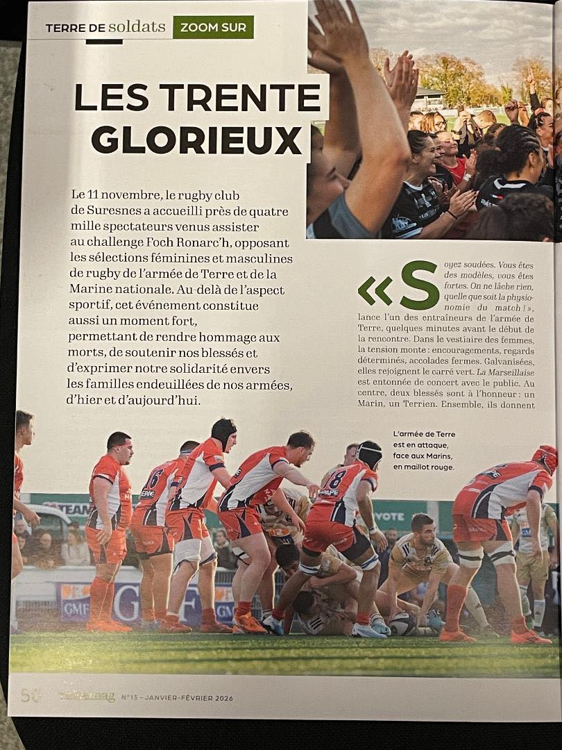 Le TerreMag de janvier-février 2026 revient sur le trophée Foch-Ronarc’h, ce match de rugby qui oppose tous les 11 novembre les équipes masculines et féminines de l’armée de Terre à celles de la Marine… le tout pour collecter des fonds pour Terre Fraternité-ADO et pour l’Entraide Marine-ADOSM.