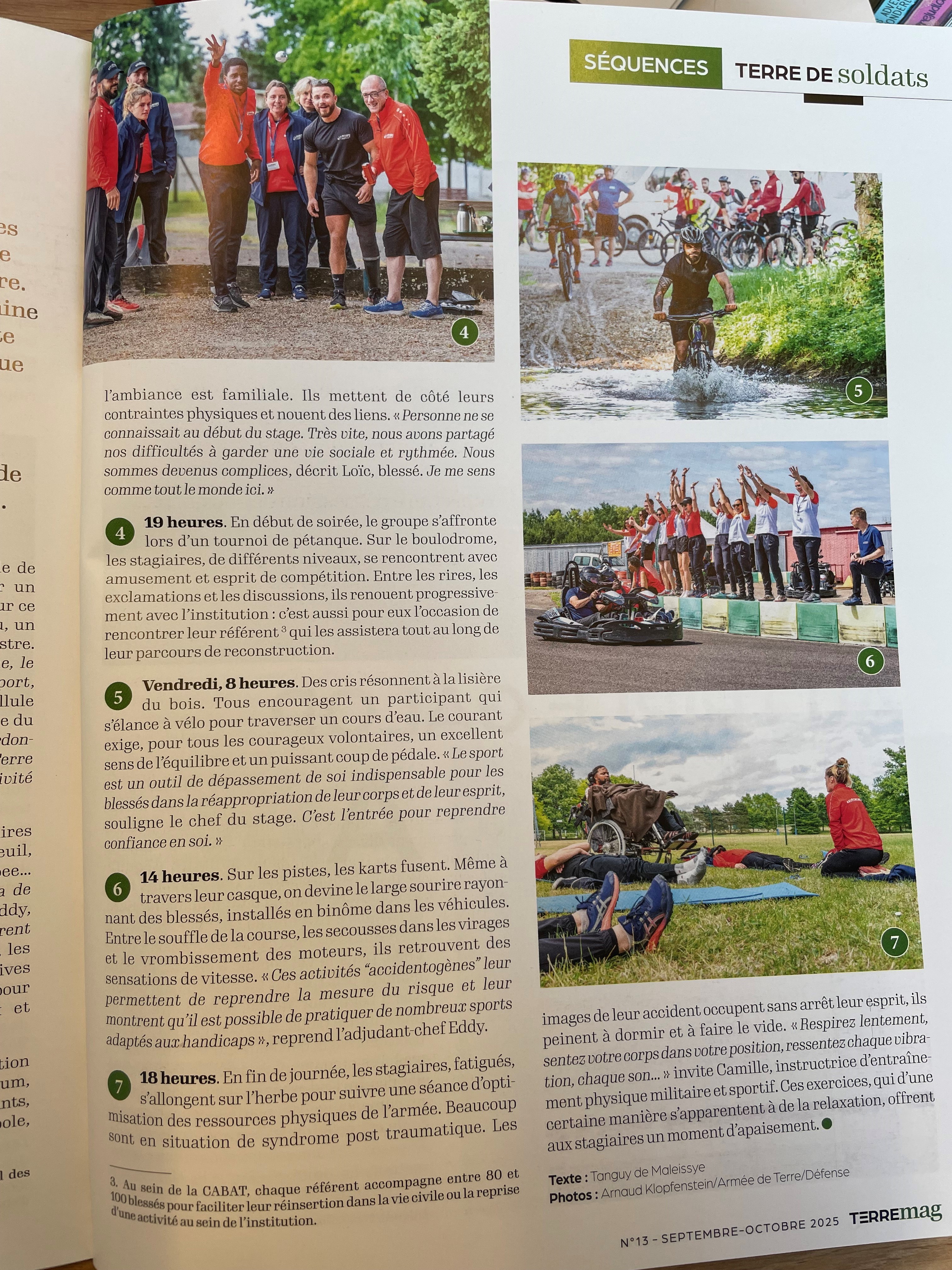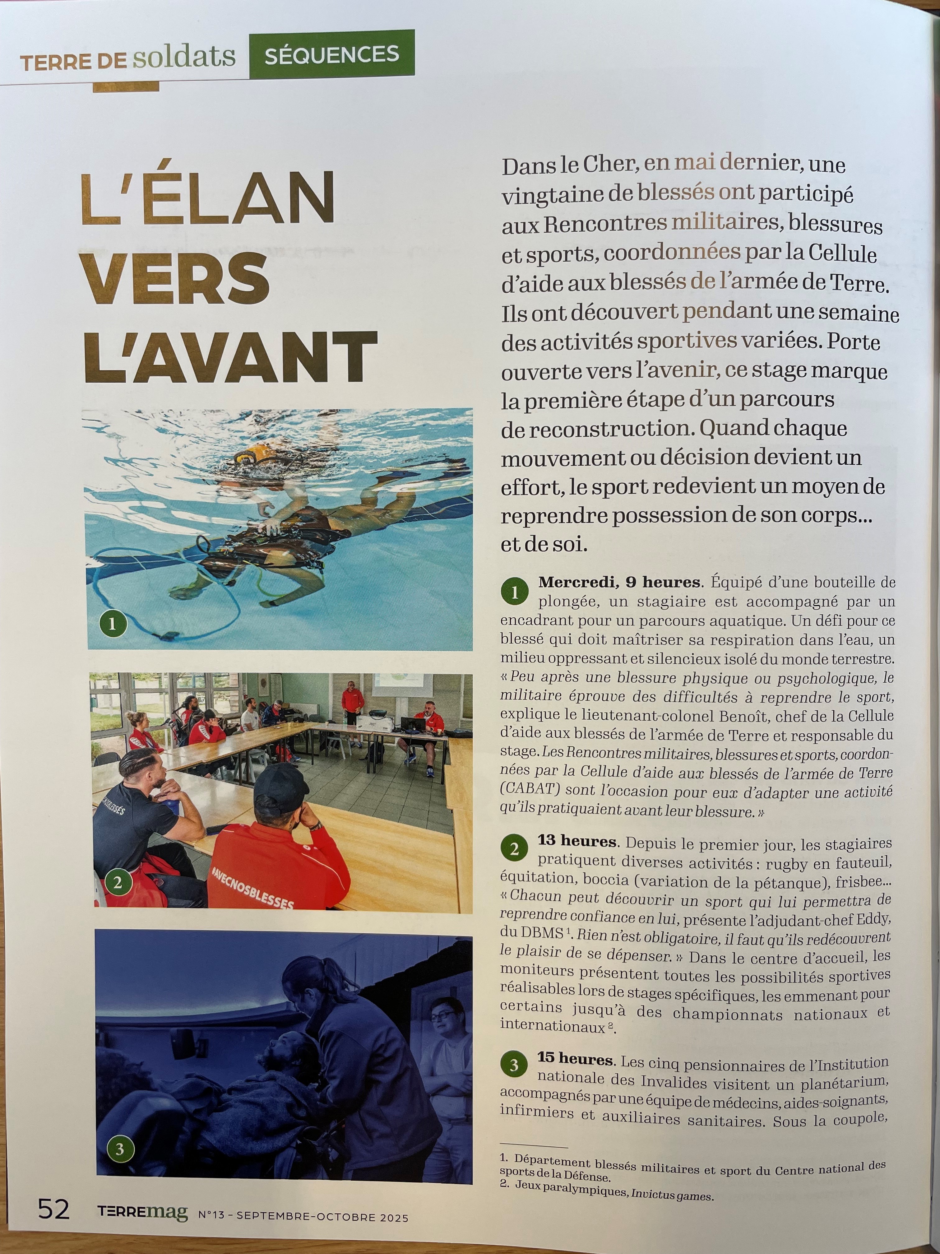 Dans son numéro de septembre-octobre, Terre Magazine revient sur les Rencontres militaires blessure et sport, un stage « découverte sportive » organisée par la CABAT pour les blessés des armées. Depuis la toute première édition, Terre Fraternité-ADO (alors encore Terre Fraternité « tout court ») fait partie du club des mécènes de ces RMBS.