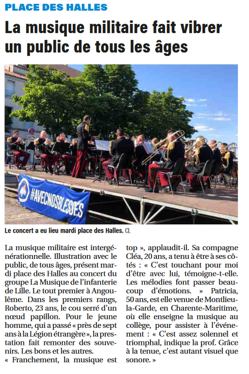 Merci au colonel Alain Ulm, commandant de la place d’armes d’Angoulême, et à ses équipes, pour l’organisation du concert de la musique de l’infanterie le 8 juillet dernier sur la place des Halles d’Angoulême.