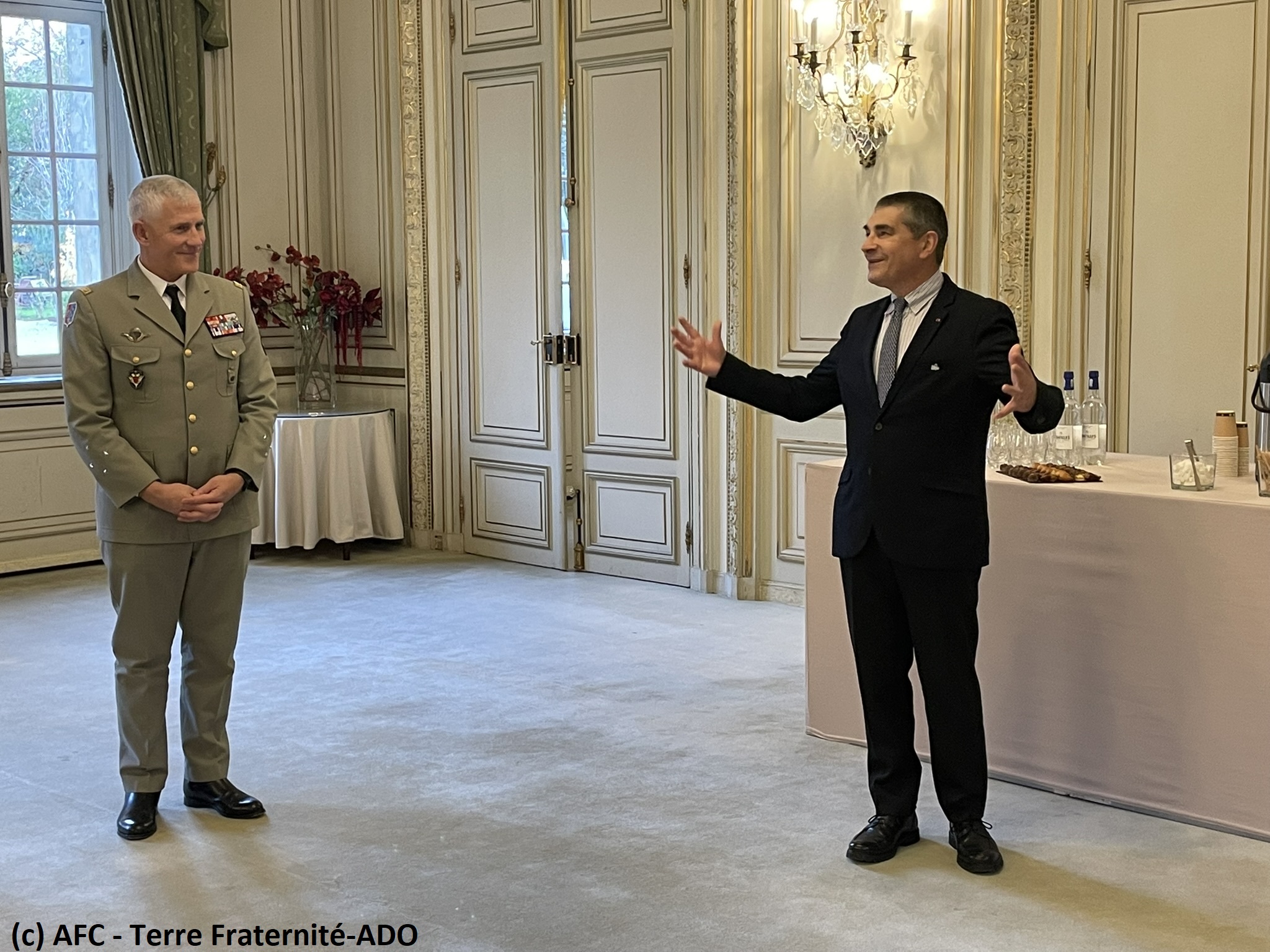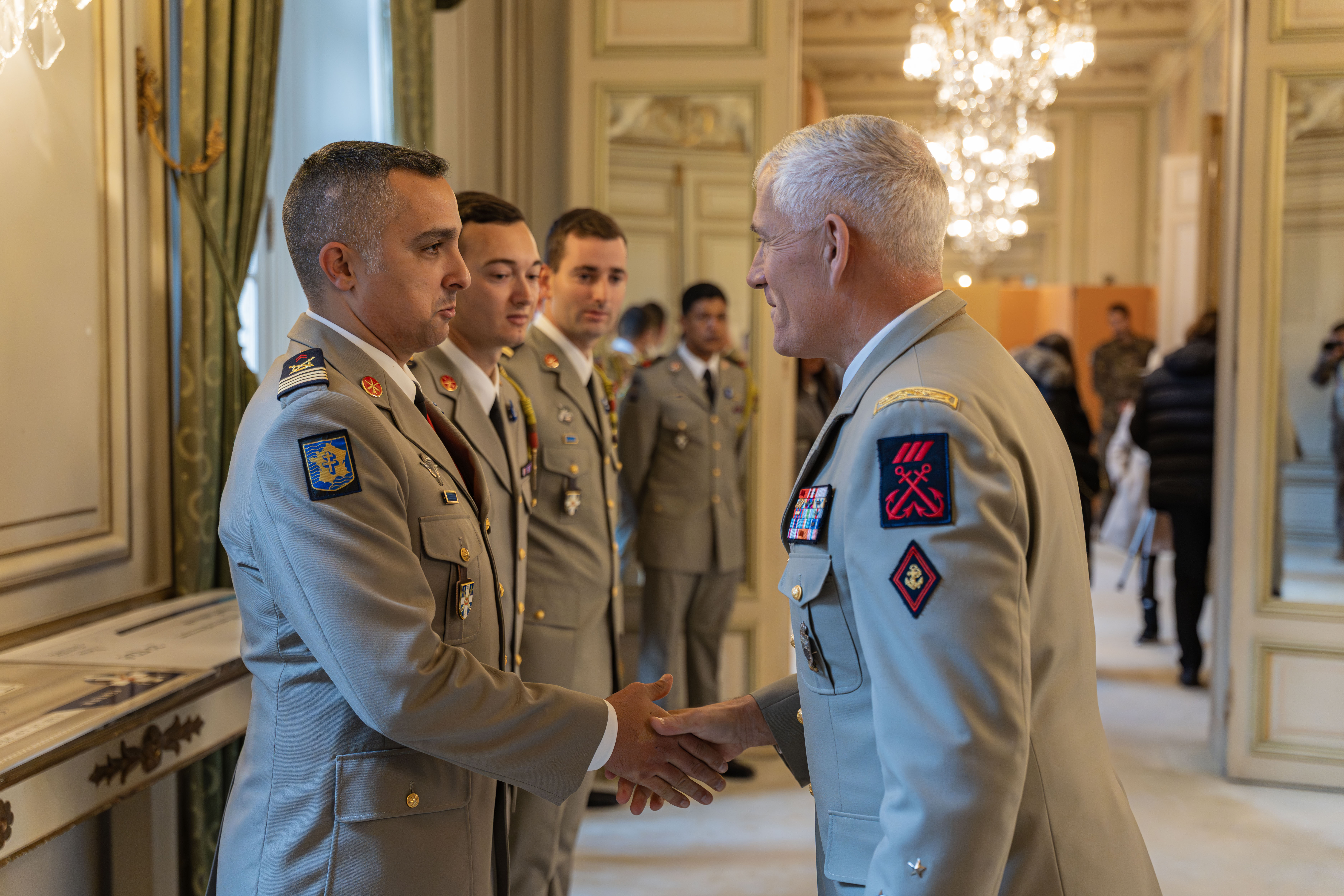 Le chef de corps, le colonel de Carbonières, est donc venu aux Invalides accompagné de représentants de toutes les batteries et de toutes les catégories de personnel, pour remettre un chèque de 20 000 € à Terre Fraternité-ADO. Devant le Gouverneur militaire de Paris, le général Margail, président de notre association, a ainsi pu remercier en personne les acteurs de ce remarquable succès collectif, qui a mobilisé l’ensemble du régiment.
